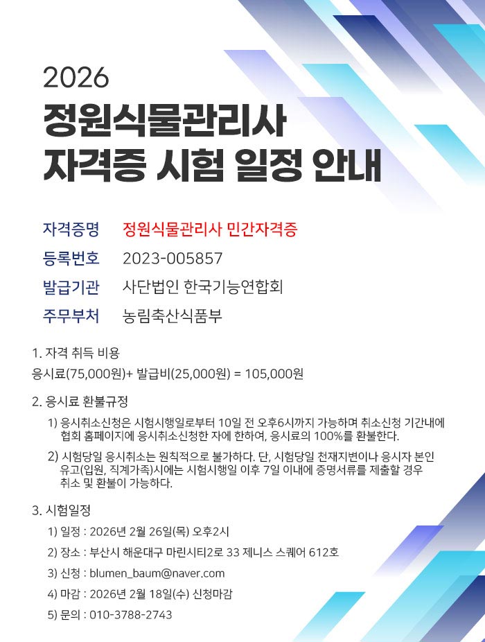 안녕하세요. 사단법인 한국기능연합회입니다. 2026년 정원식물관리사 자격증 시험 일정 관련하여 내용을 올려드리오니 참고하시길 바랍니다. 첨부파일에는 정원식물관리사 민간자격증 응시원서가 포함되어 있습니다. 정원식물관리사 민간자격증에 대한 자세한 문의는 010-3788-2743 으로 연락부탁드립니다.
